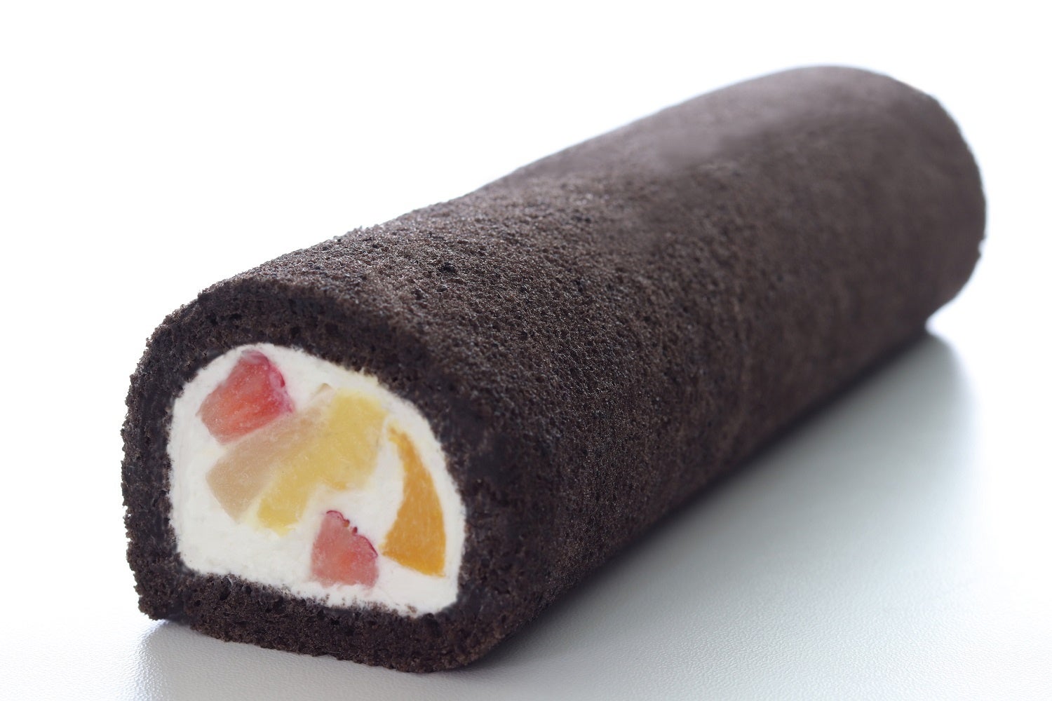 ブラックココアを使用したジェノワーズ生地にフルーツとカスタードクリームをクレームシャンティーイでサンドしました。