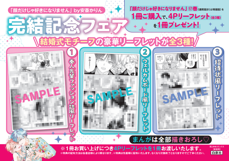 「顔だけじゃ好きになりません」17巻通常版または特装版いずれかをご購入の方に、結婚式をテーマにした4Pリーフレットをプレゼントいたします。