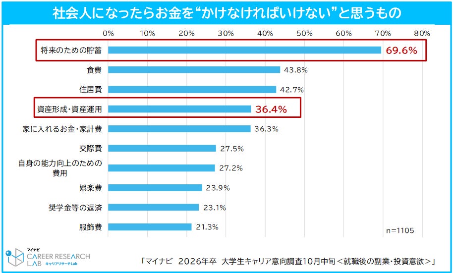 社会人になった際に「お金を“かけなければいけない”と思うもの」について聞いたところ、最も多かった回答は「貯蓄(69.6%)」であった。また「資産形成・資産運用(36.4%)」をあげる学生も3人に1人と、資産形成への意識は決して低くないことがわかる。
