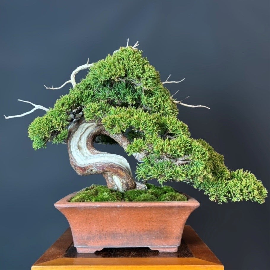 真柏は神(ジン)舎利(シャリ)といわれる白骨化した部分と、根から吸い上げている茶色い水吸いとのコントラストが特徴で、生命力の強さと芸術性の高さから松に劣らず人気の高い樹種です。中でも糸魚川真柏は他の真柏よりも葉が細かく綺麗です。また、暑さにも強く管理面からも国内のみならず海外の盆栽愛好家からも高い評価を得ています。