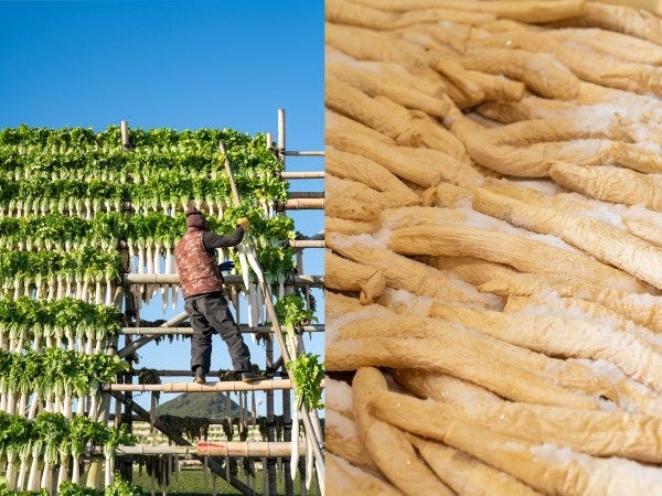12月~2月の大根の収穫時期にのみ限定販売している新物のたくあん。旬の寒干し大根をそのまま浅漬けで仕上げた、寒干し大根本来の味をお楽しみいただける期間限定商品です。