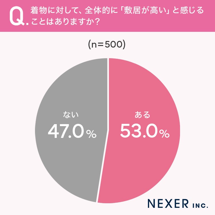 その結果「ある」が53.0%、「ない」が47.0%でした。約2人に1人が、着物に対して何らかのハードルを感じていることがわかります。