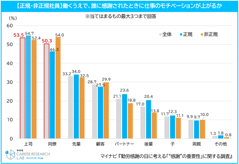 正規・非正規で働く人に、「誰に感謝された時に仕事のモチベーションが上がるか」を聞いたところ、全体では「上司(53.5%)」、「同僚(50.3%)」が上位となった。