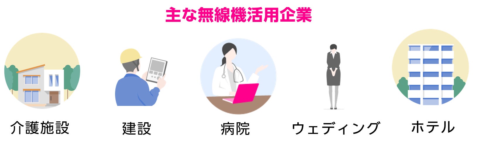 アナログ無線機を活用する主なジャンルは、「ホテル」「医療・介護」「ウェディング」「イベント」「建設」など、複数の人数で同時に1つの業務を遂行するために、リアルタイムでコミュニケーションを必要とする業界で多く導入されています。例えば、建設業界では、工事現場で1グループ3名から5名のチームを3チームで作業する場合、チームのメンバー全体に音声を届けるためには最低でも3つの送信機を設置して作業します。1つの企業が複数の現場をかかえている場合、その現場数の分だけ送信機が必要になってくることから、数多くの送信機の設置が必要となっています。