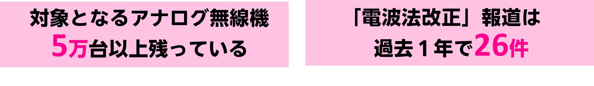 生活にかかわる機器類のデジタル化が進む中、今後も電波利用の需要が増加することが予想されており、貴重な資源とされています。災害時や緊急時など、使いたいときに電波が使えないという状況を回避し、不必要な電波量を削減するため、350MHz帯と400MHz帯を使用するアナログ無線機の利用を禁止することが決定しました(注2)。今回対象となるアナログ無線機の数は5万台以上にのぼるのですが、「電波法改正」報道は過去一年で26件程度です(注3)(注4)。また、今後も引き続き電波帯の規制はかけられていくことが予想されます。
