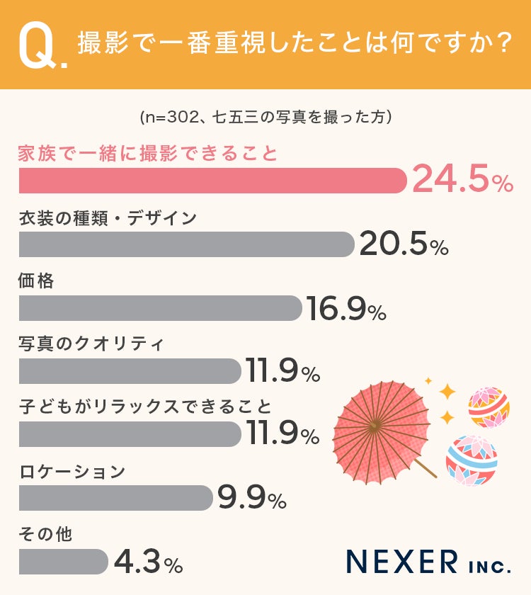 撮影で最も重視されたのは「家族で一緒に撮影できること」です。七五三は子どもの成長を残すだけでなく、家族の思い出を形にする機会にもなっているようです。七五三の撮影を検討されている方は、ご家族にとって最適な撮影スタイルを見つけてみてはいかがでしょうか。
