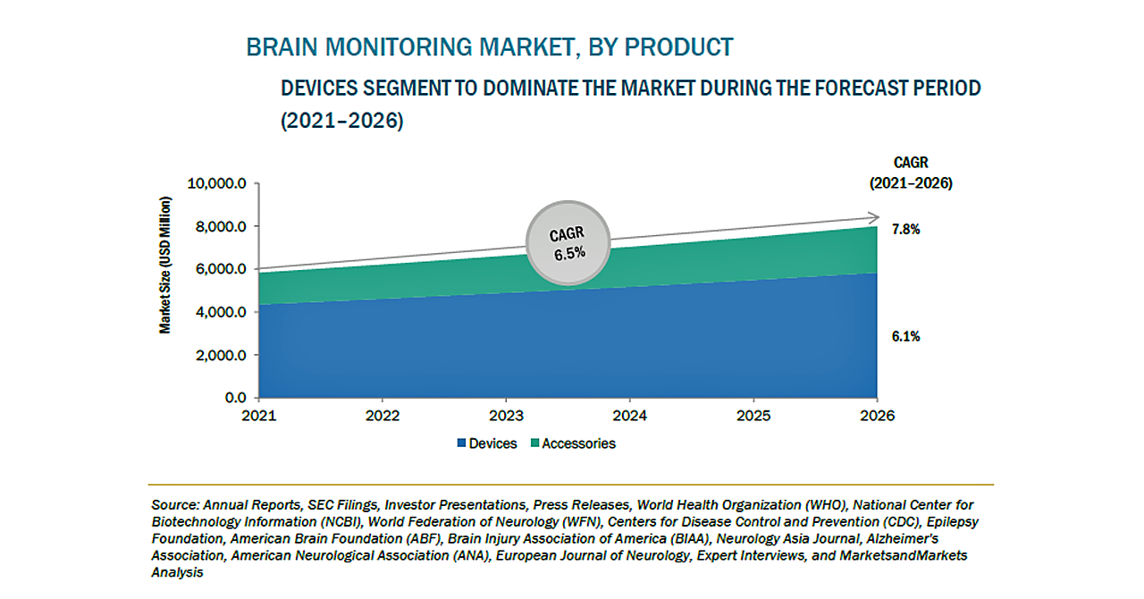 脳機能モニタリングの市場規模は、2021年の58億米ドルからCAGR6.5%で成長し、2026年には80億米ドルに達する予測されています。脳モニタリング市場は、神経疾患の発生率と有病率の増加、神経変性疾患に対する意識の高まり、外傷性脳損傷の増加、臨床試験における脳モニタリングの応用の増加などが主な要因となっています。また、非侵襲性・低侵襲性機器の需要の高まり、脳モニタリング機器の治療用途の拡大、新興国での医療市場の拡大なども、市場のプレーヤーに成長の機会を提供すると期待されています。