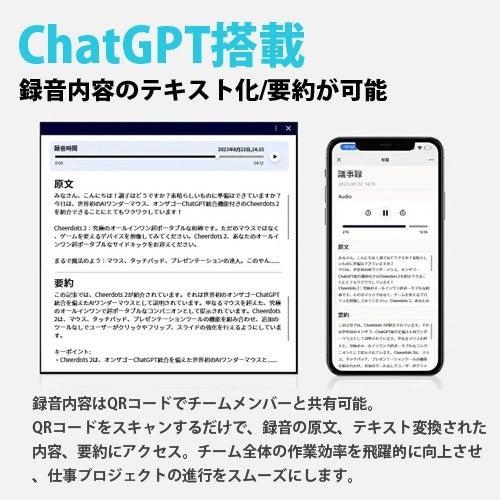 AI機能(ChatGPTコア)が搭載されており、録音した音声を数秒でテキストに変換し、重要なポイントを自動的に抽出して要約として整理します。