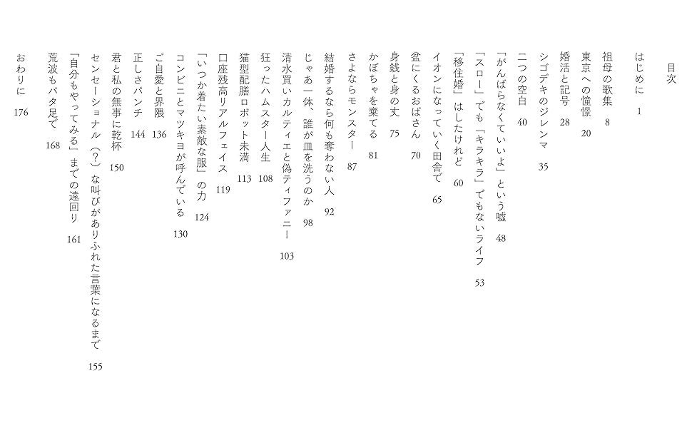最寄りの書店までチャリを40分漕がなければならない地元を出て、東京で暮らし、再び地元に移住。地方で暮らすとはどういうことか?どこに住むのが幸せなのか……。そこにある生活を真摯に見つめて見えてきたこと。(「東京への憧憬」ほか)