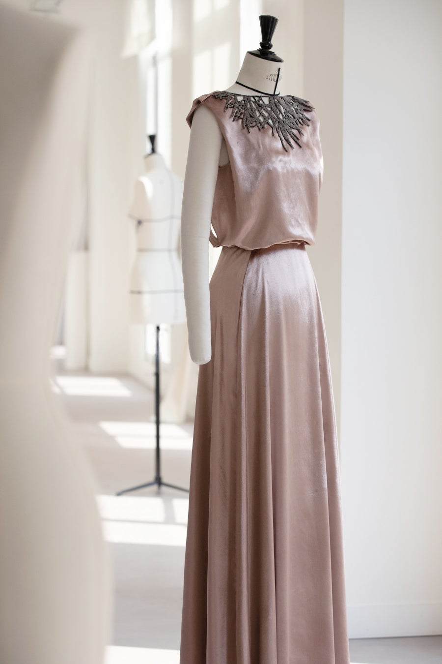 ヴァレリア・ゴリノは刺繍をあしらったピンクのベルベットドレスを着用しました。このドレスの刺繍には、78時間が費やされ完成に導かれました。メイクアップはディオール ビューティです。