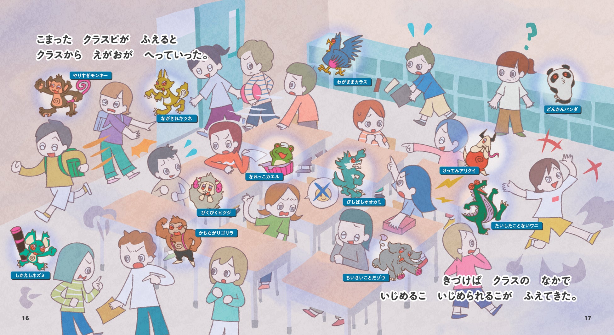 ところが、いいクラスピは、まちがった考えを持つと「こまったクラスピ」に変身。「ごきげんモンキー」は「やりすぎモンキー」に、「おたすけヒツジ」は「びくびくヒツジ」に。いじめ行動のそばにいるのは、これらの「こまったクラスピ」です。