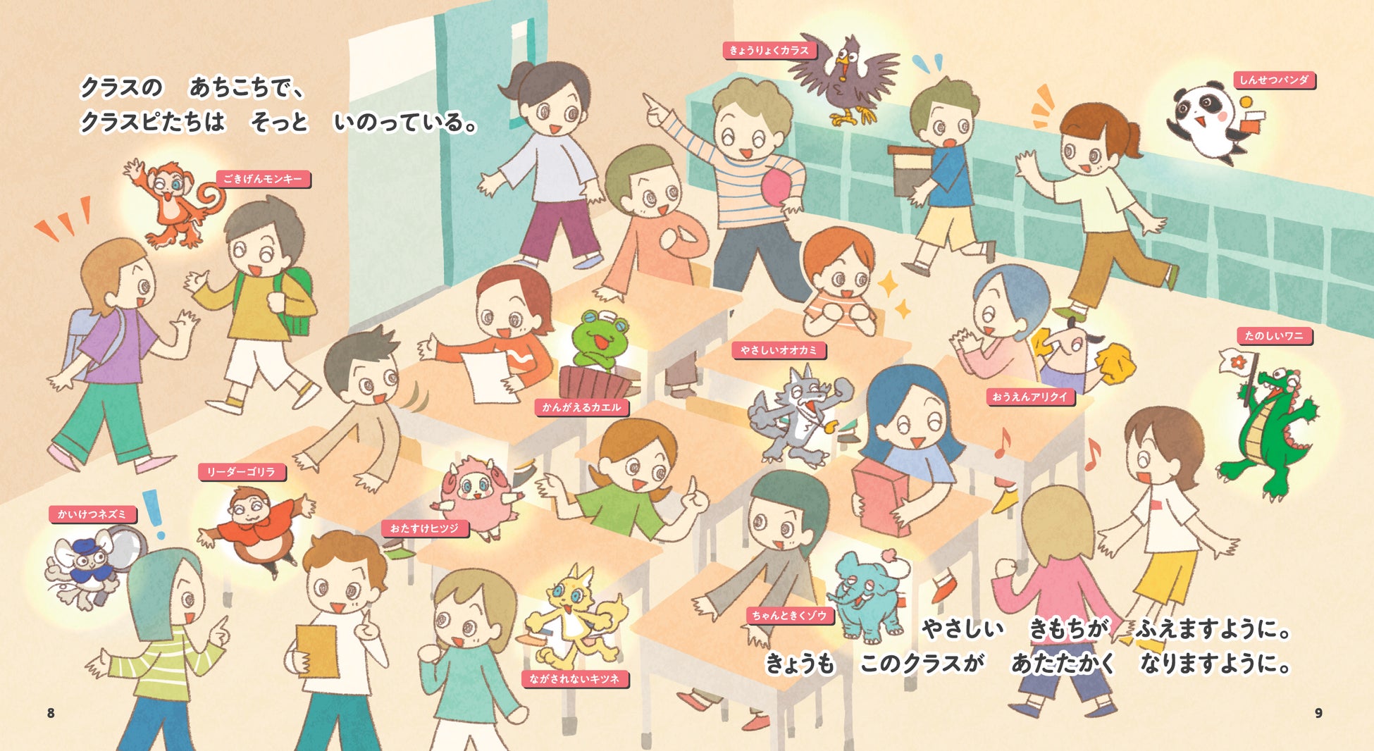クラスピの普段の姿は、子どもたちの行動をそっと見守る存在として描かれています。元気に挨拶する子のそばには「ごきげんモンキー」、誰かに声をかける子のそばには「おたすけヒツジ」など。タイプ別に12のクラスピが描かれます。これらの「いいクラスピ」たちは、やさしく、あたたかなクラスをつくりだし、子どもたちが前向きな行動を取ることの大切さを楽しく教えてくれます。