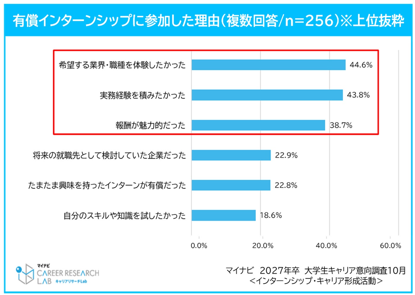 交通費や昼食代以外の給与が支払われるような「有償インターンシップ」に参加したことのある割合は17.8%だった。参加した理由を聞くと、「希望する業界・職種を体験したかった(44.6%)」が最多で、次いで「実務経験を積みたかった(43.8%)」、「報酬が魅力的だった(38.7%)」となった。また、「有償インターンシップ」と「無償インターンシップ」の違いについて聞いたところ、「実務に近い経験ができたもの(54.9%)」が最多で、次いで「自分に責任ある仕事が任されたと思えたもの(50.7%)」「教育的なサポートが充実していたもの(48.9%)」となったが、いずれの項目も「有償インターンシップ」が高い結果となった。「有償インターンシップ」は報酬があることで社会人としての労働の対価を得る経験ができるほか、「無償インターンシップ」よりも実務性や責任感を伴う経験ができることで、結果として学びの質が向上するという効果が期待できる。【図4、5、6】