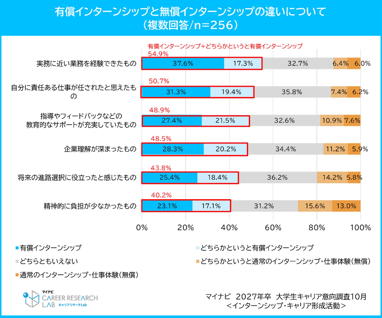 また、「有償インターンシップ」は「無償インターンシップ」に比べて実務性や責任感、教育的サポートの面で優位性を示しており、結果として学びの質を向上させることに繋がっている可能性がみられました。よりリアルな職場体験を通じて、自分の適性や働き方を深く理解したいと考えている学生にとって、有償インターンシップは有力な選択肢となるでしょう。キャリア形成の一歩として、目的に応じてこうした機会を積極的に活用することが、将来の意思決定に大きなヒントとなりえます。