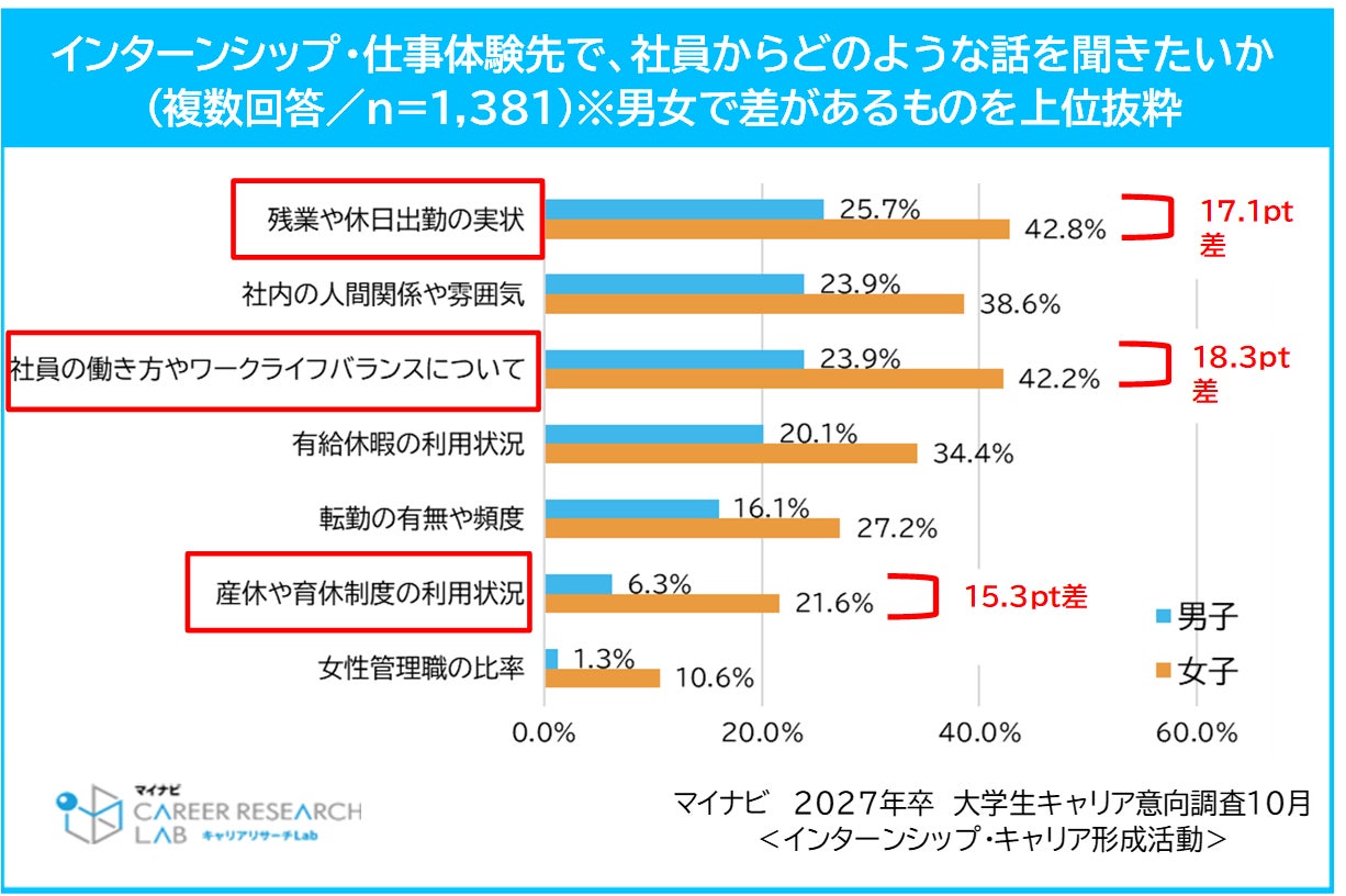インターンシップ・仕事体験先で、女子の方が働き方やライフイベントとの両立に関する情報を重要視。給与が支払われる「有償インターンシップ」の参加率は17.8%。実務性や責任感を伴う経験ができたという声も