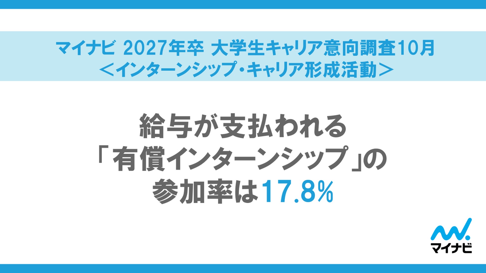 株式会社マイナビ(本社:東京都千代田区、代表取締役 社長執行役員:土屋芳明)は、2027年卒業予定の全国の大学生、大学院生を対象に実施した、「マイナビ 2027年卒 大学生キャリア意向調査10月<インターンシップ・キャリア形成活動>」の結果を発表しました。