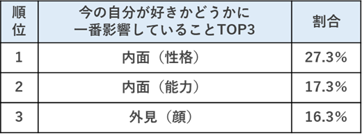 最も影響しているのは1位「性格」、2位「能力」、3位「外見(顔)」で、内面の方が上位に