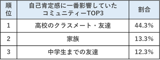 現役高校生の「自己肯定感に関するアンケート」“今の自分が好き?”「YES」が過半数、最も影響していることは「内面(性格)」自己肯定感に一番影響していたコミュニティーは、1位「高校のクラスメート・友達」