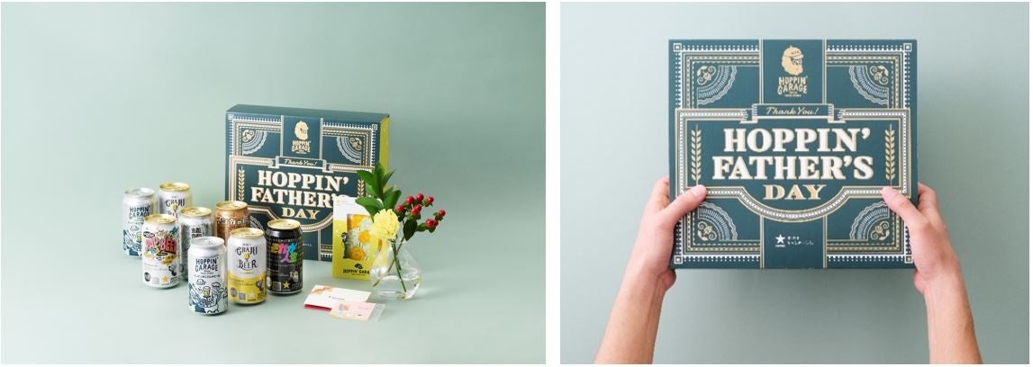 「HOPPIN’ GARAGE」では年に一度の父の日に感謝の気持ちを伝える特別な乾杯をお届けしたく、オリジナルギフトセットを販売します。本商品は、6月発売予定の最新作「HOPPIN’ GARAGE 婚姻のグレジュビール」(注1)を含む人気商品の詰め合わせや、感謝を伝えるメッセージカードとペアグラスがセットになっており、父の日のギフトにぴったりのオリジナルパッケージで包まれています。