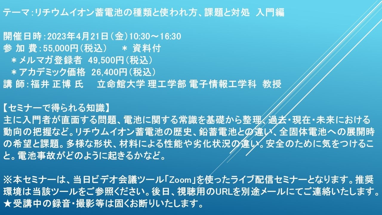 先端技術情報や市場情報を提供している(株)シーエムシー・リサーチ(千代田区神田錦町: https://cmcre.com/ )では、 各種材料・化学品などの市場動向・技術動向のセミナーや書籍発行を行っておりますが、 このたび「リチウムイオン蓄電池の種類と使われ方、課題と対処 入門編」と題するセミナーを、 講師に福井 正博 氏 (立命館大学 理工学部 電子情報工学科 教授)をお迎えし、2023年4月21日(金)10:30より、 ZOOMを利用したライブ配信で開催いたします。 受講料は、 一般:55,000円(税込)、 弊社メルマガ会員:49,500円(税込)、 アカデミック価格は26,400円(税込)となっております(資料付)。