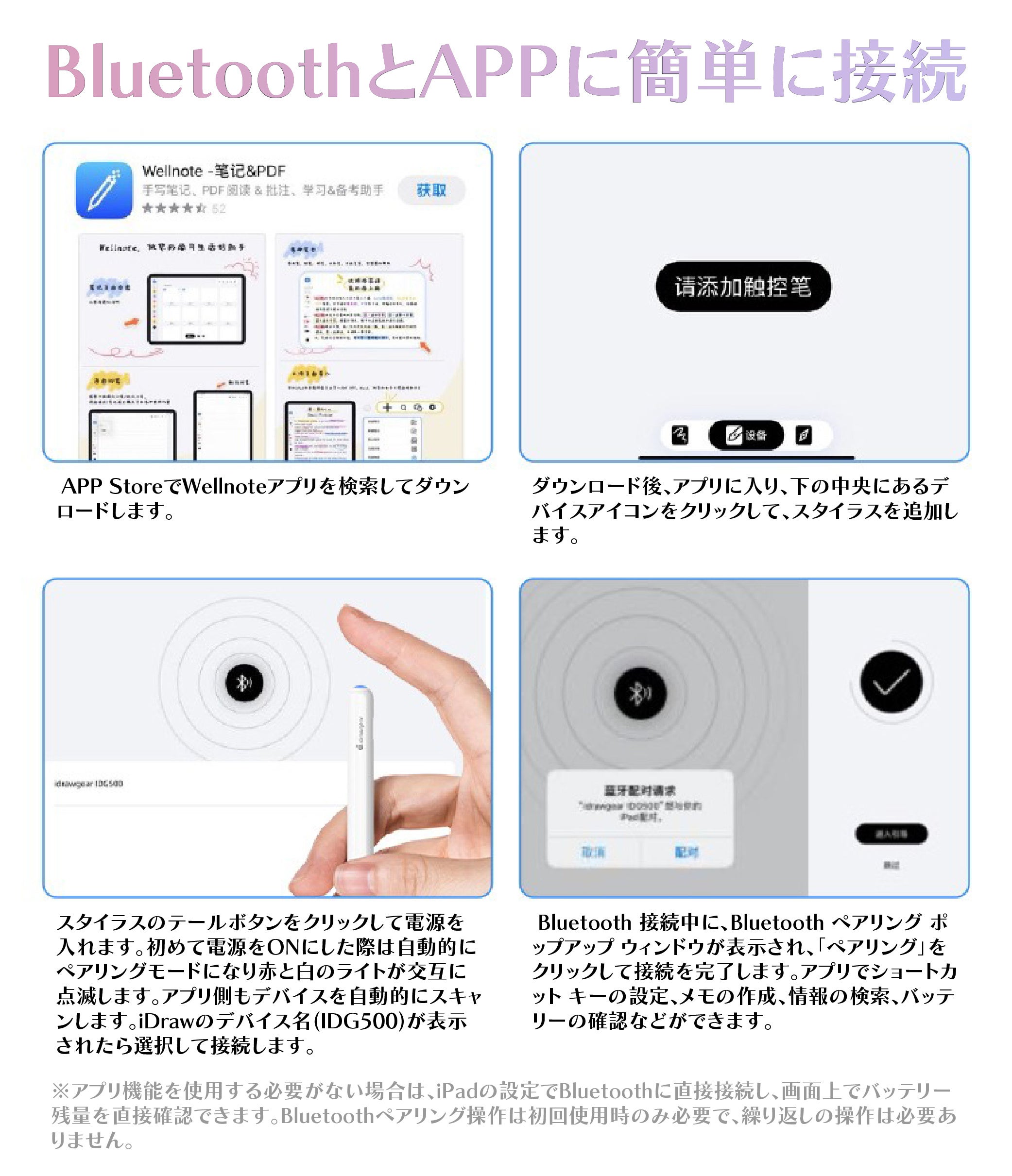 注: アプリ機能を使用する必要がない場合は、iPadの設定でBluetoothに直接接続し、画面上でバッテリー残量を直接確認できます。Bluetoothペアリング操作は初回使用時のみ必要で、繰り返しの操作は必要ありません。