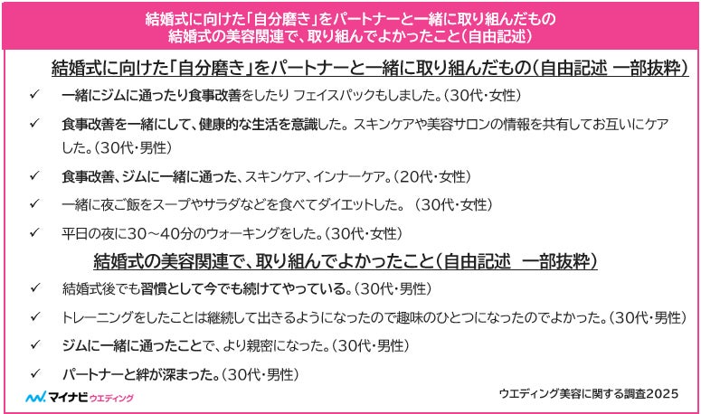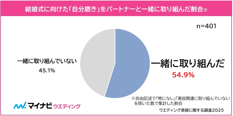 結婚式に向けた美容や健康活動などの「自分磨き」をパートナーと一緒に取り組んだ割合は54.9%と、半数以上がパートナーと一緒に美容や健康活動に取り組むことがわかった。特に男性からは、ジム通いや食事改善、スキンケア情報の共有などを通じて、「絆が深まった」「習慣として今も続けている」という声も多く、結婚式に向けた美容が単なる外見の準備に留まらず、ふたりの関係性を深め、生活習慣を整えるきっかけとしてポジティブな影響を与えていることがわかった。
