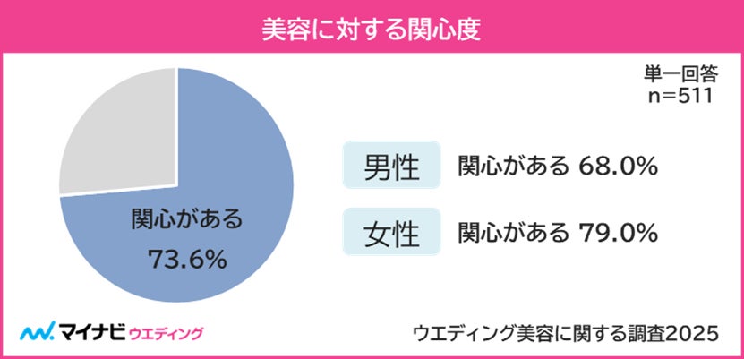 2023年10月~2025年9月に結婚式を行った20~39歳までの男女に美容に対する関心度を聞くと、73.6%が「関心がある」と回答した。男女別では男性68.0%、女性79.0%と男女ともに美容に対する関心の高さがうかがえた。【図1】