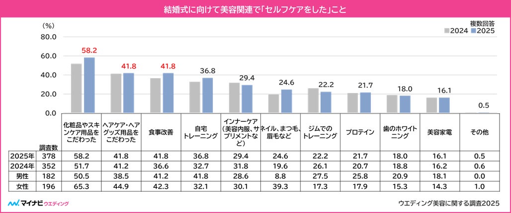 結婚式に向けて「セルフケアをした」のが最も多かったのは、「化粧品・スキンケア(58.2%)」「ヘアケア(41.8%)」「食事改善(41.8%)」となった。外見だけでなく、体の内側から整える意識の高さもみられた。 【図2、3、4】