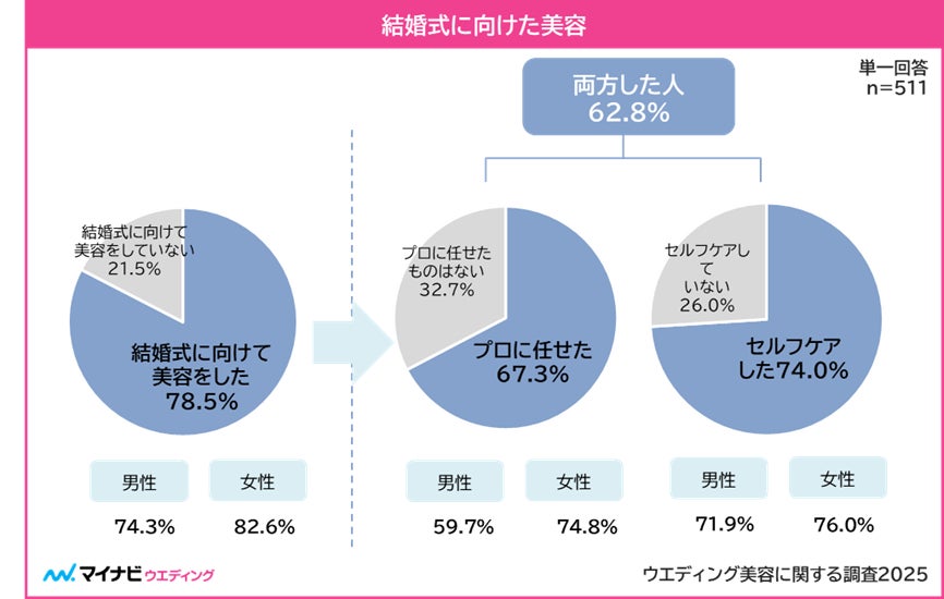 結婚式に向けて美容に関する取り組みをした割合は78.5%だった。内訳をみると、「プロにお任せした」が67.3%、「セルフケアをした」が74.0%であり、「両方取り組んだ」は、62.8%と、結婚式に向けて、積極的に自分磨きに取り組む人が多いことがわかる。