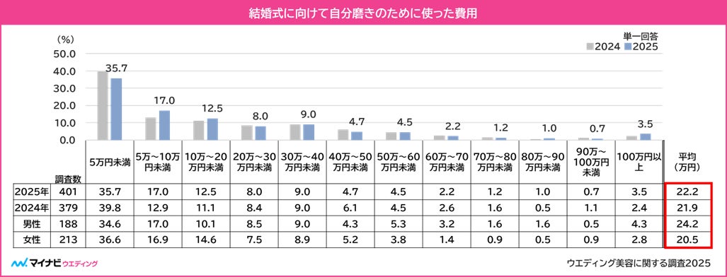結婚式に向けて「自分磨き」のために使った費用は、男性24.2万円(前年比3.6万円減)、女性20.5万円(前年比3.7万円増)で平均22.2万円(前年比0.3万円増)、となった。男女ともに一定の投資がみられる一方で、「100万円以上」の高額層が前年より増加しており、平均値を押し上げる結果となった。実際には「5万円未満」が最多で、投資額には大きな個人差がみられた。また、女性の投資が増える一方で、依然として男性の投資額が高い傾向も確認され、美容への関心は男女問わず広がっていることがうかがえる。【図5、6、7】
