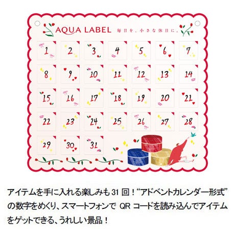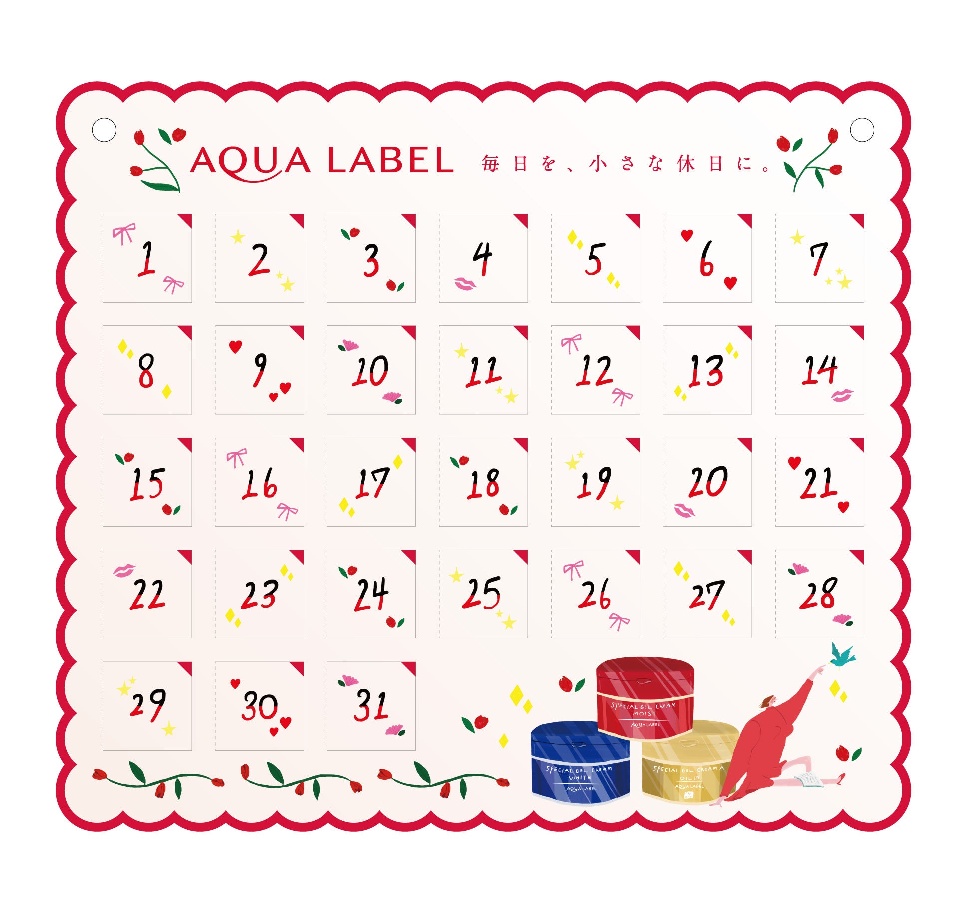 「頼れるものには頼って、毎日を小さな休日にしよう。」そんな思いを込めて、毎日を小さな休日にしてくれる31個のアイテムが詰まったギフトや、「アクアレーベル スペシャルジェルクリーム」を抽選でプレゼントするキャンペーンを実施します。当選された方は、お手元に届く“アドベントカレンダー”に刻まれた31日分の数字をめくって、印刷されているQRコードをスマートフォン/タブレットで読み込みアイテムを受け取っていただきます。本キャンペーンへの応募方法はアクアレーベル公式Twitterアカウント(@aqua_label_)をフォローし、該当のツイートをリツイートするだけ。ぜひお気軽にご参加ください。