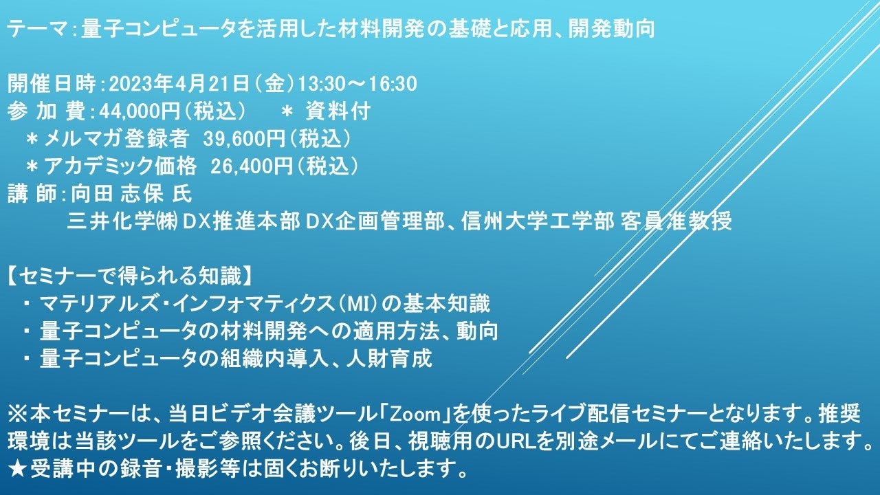 先端技術情報や市場情報を提供している(株)シーエムシー・リサーチ(千代田区神田錦町: https://cmcre.com/ )では、 各種材料・化学品などの市場動向・技術動向のセミナーや書籍発行を行っておりますが、 このたび「量子コンピュータを活用した材料開発の基礎と応用、開発動向」と題するセミナーを、 講師に向田 志保 氏 (三井化学(株) DX推進本部 DX企画管理部、信州大学工学部 客員准教授)をお迎えし、2023年4月21日(金)13:30より、 ZOOMを利用したライブ配信で開催いたします。 受講料は、 一般:44,000円(税込)、 弊社メルマガ会員:39,600円(税込)、 アカデミック価格は26,400円(税込)となっております(資料付)。