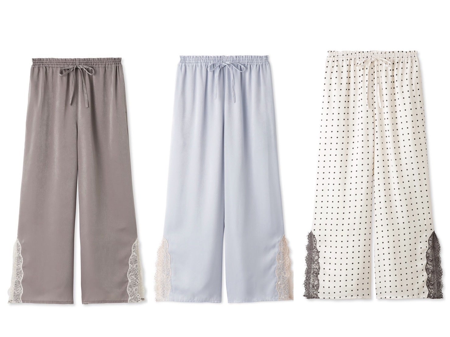 パンツは、ふんわりしたはき心地と短すぎない丈感がポイント。繊細なレースをあしらったサテンキャミソールとのコーディネートがおすすめです。