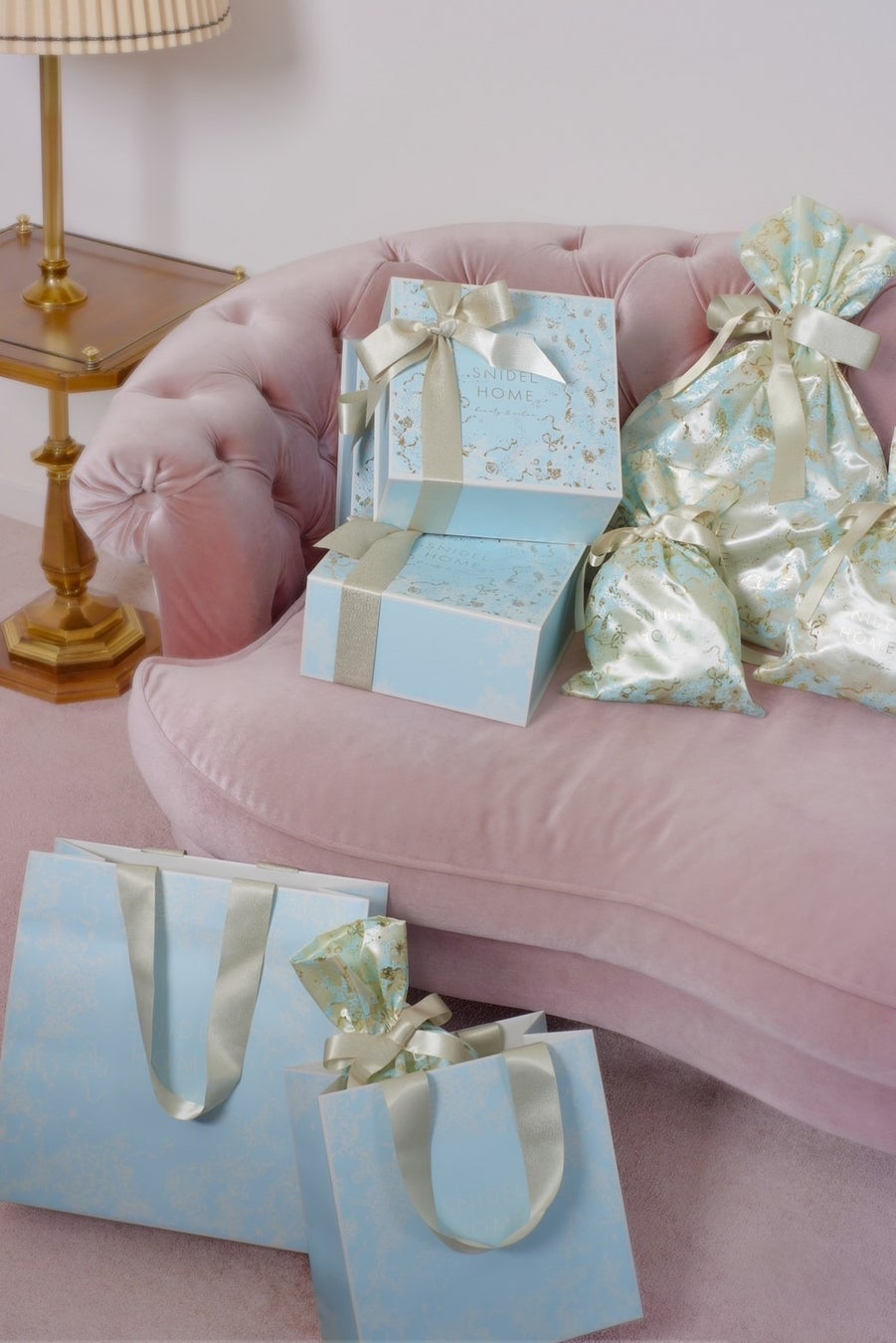 今年のホリデーコレクションでは、リボンモチーフをベースにシャンパンゴールドの箔プリントをのせた、ホリデーシーズンにぴったりの特別なギフトラッピングを作りました。リボンの片面にはSNIDEL HOMEのロゴを入れてポイントに。1年頑張った自分へのご褒美にもおすすめです。