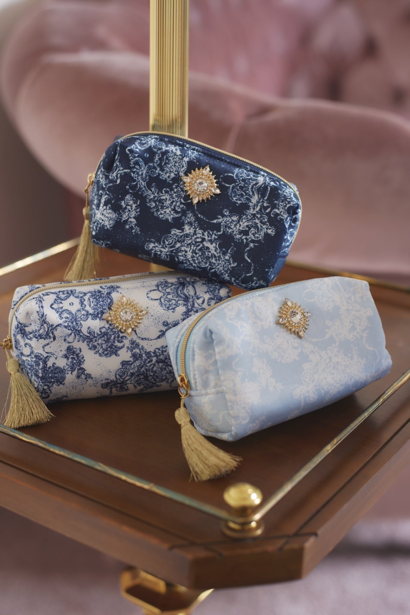 タッセル付きのコロンとしたスクエアポーチは、普段使いのメイクポーチとしてぴったりなサイズ感。さりげなくきらめくビジューとプリント柄のコンビネーションが特別感をプラスします。