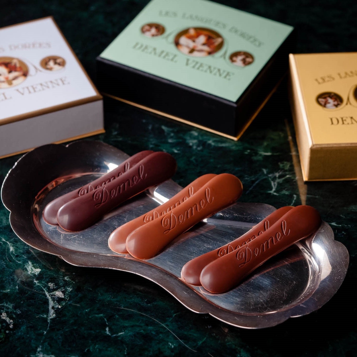 デメルを代表する猫の舌の形をしたチョコレート。3つの味をご用意。