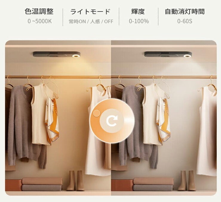 ゆっくり光る優しい光でクローゼット内の補助光としても活躍します。