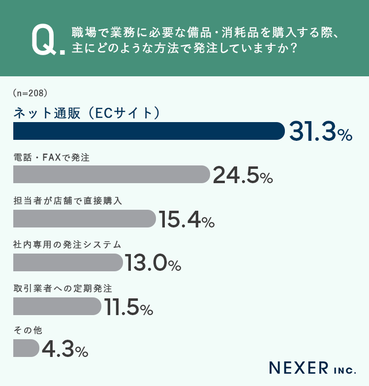最も多かったのは「ネット通販(ECサイト)」で31.3%でした。次いで「電話・FAXで発注」が24.5%、「担当者が店舗で直接購入」が15.4%と続きます。
