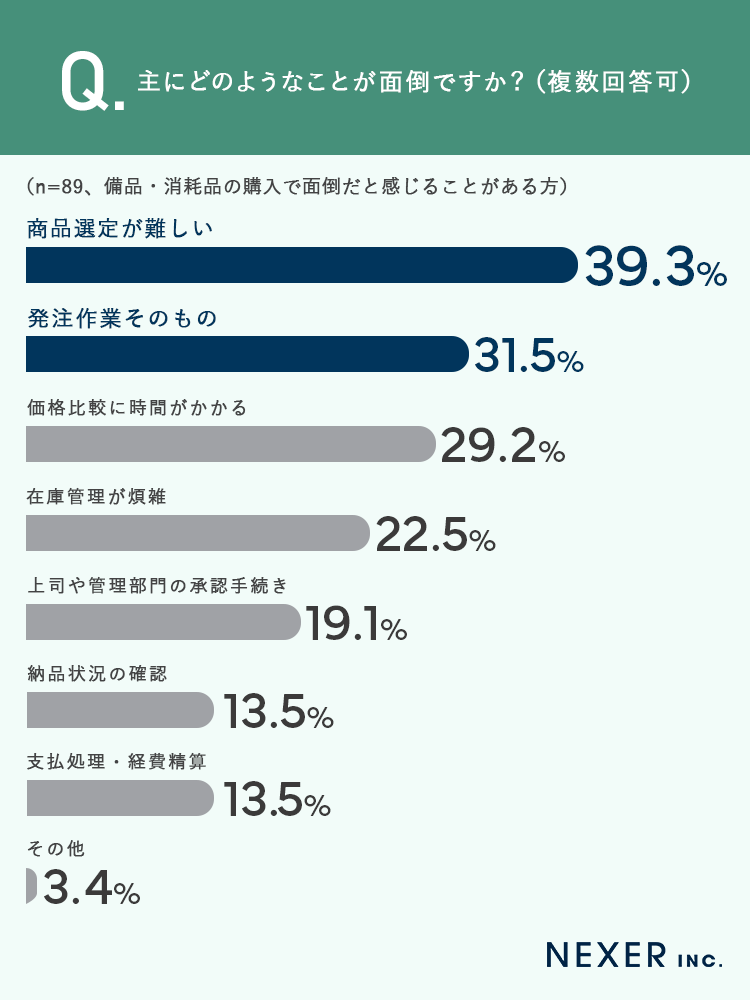 最も多かったのは「商品選定が難しい」で39.3%でした。次いで「発注作業そのもの」が31.5%、「価格比較に時間がかかる」が29.2%、「在庫管理が煩雑」が22.5%と続きました。