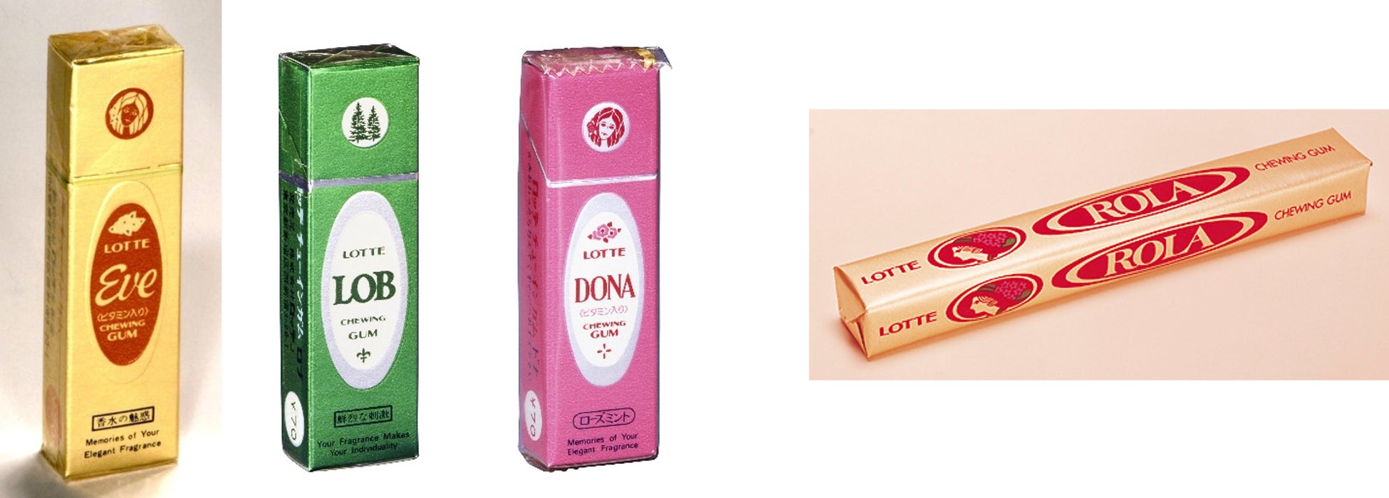 「イブ」は、香水の箱をイメージし、当時珍しい縦型の箱タイプのパッケージでした。「イブ」のヒットにより、その後香りのガムはシリーズ化され、花香ガム「ローラ」(1976年発売)、森の香り「ロブ」(1980年発売)、バラの香り「ドナ」(1984年発売)を発売しました。