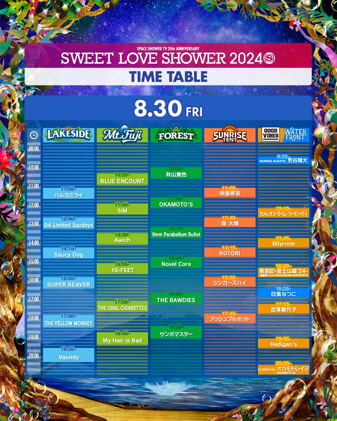 秋山黄色 / THE YELLOW MONKEY / Awich / OKAMOTO’S / THE ORAL CIGARETTES / カメレオン・ライム・ウーピーパイ / 9mm ParabellumBullet / KOTORI / 斎遊記富士山編'24(斎藤宏介from UNISON SQUARE GARDEN/XIIX) / Saucy Dog /サンボマスター / SiM / シンガーズハイ / SUPER BEAVER / 帝国喫茶 / 10-FEET / 日食なつこ / Novel Core / Vaundy / ハルカミライ / Billyrrom / 04 Limited Sazabys / プッシュプルポット / BLUE ENCOUNT / Hedigan’s / THE BAWDIES / My Hair is Bad / 森大翔 / 吉澤嘉代子