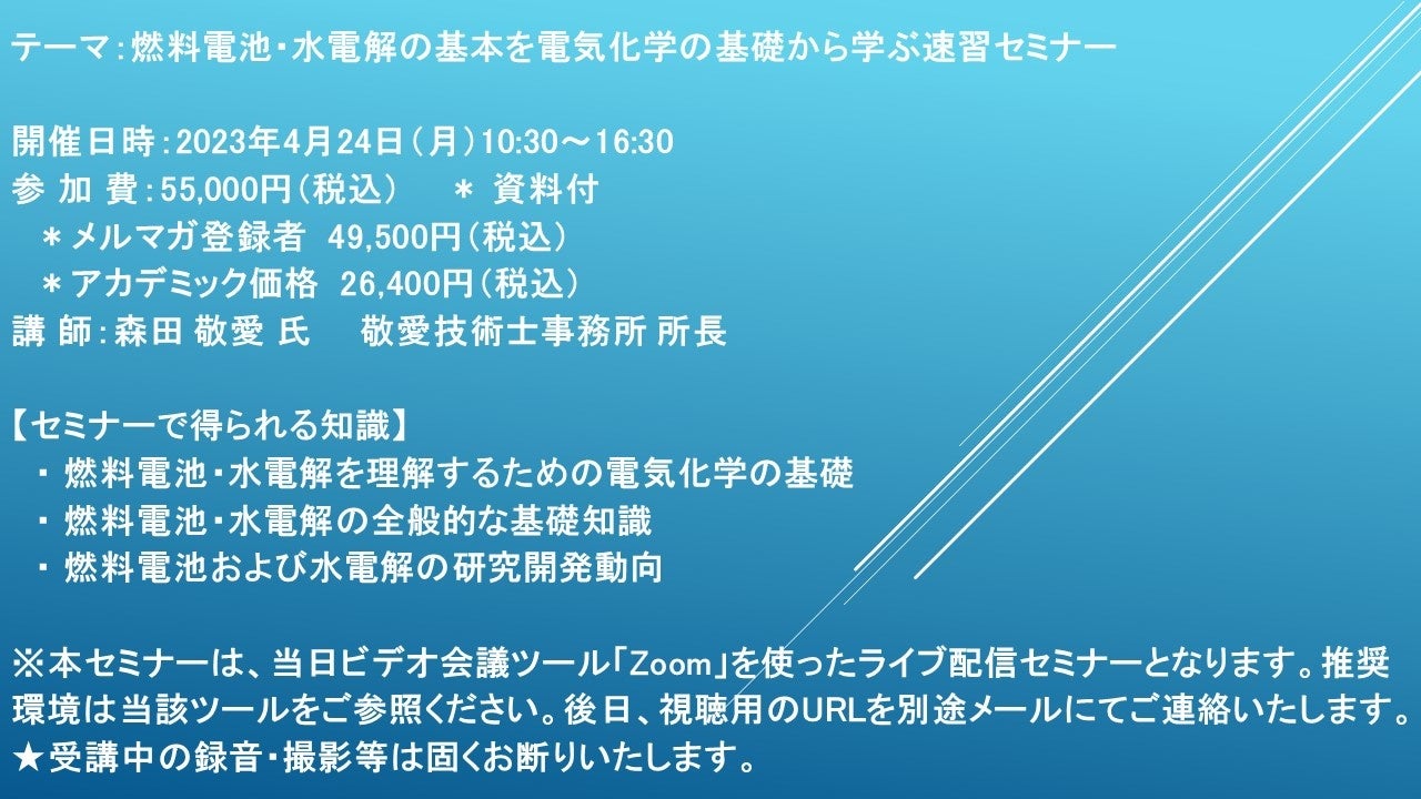 先端技術情報や市場情報を提供している(株)シーエムシー・リサーチ(千代田区神田錦町: https://cmcre.com/ )では、 各種材料・化学品などの市場動向・技術動向のセミナーや書籍発行を行っておりますが、 このたび「燃料電池・水電解の基本を電気化学の基礎から学ぶ速習セミナー」と題するセミナーを、 講師に森田 敬愛 氏 (敬愛技術士事務所 所長)をお迎えし、2023年4月24日(月)10:30より、 ZOOMを利用したライブ配信で開催いたします。 受講料は、 一般:55,000円(税込)、 弊社メルマガ会員:49,500円(税込)、 アカデミック価格は26,400円(税込)となっております(資料付)。