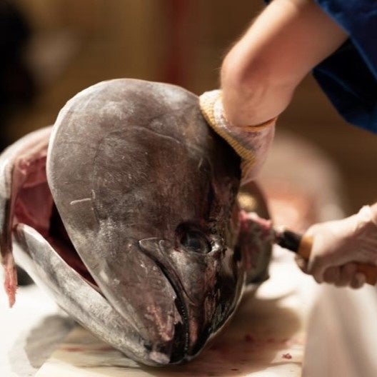 マグロの扱いを専門に半世紀、大阪市中央卸売市場で長年の経験と実績で美しいマグロを選び抜き販売している「まぐろ寺本」がマグロ解体実演販売を開催。