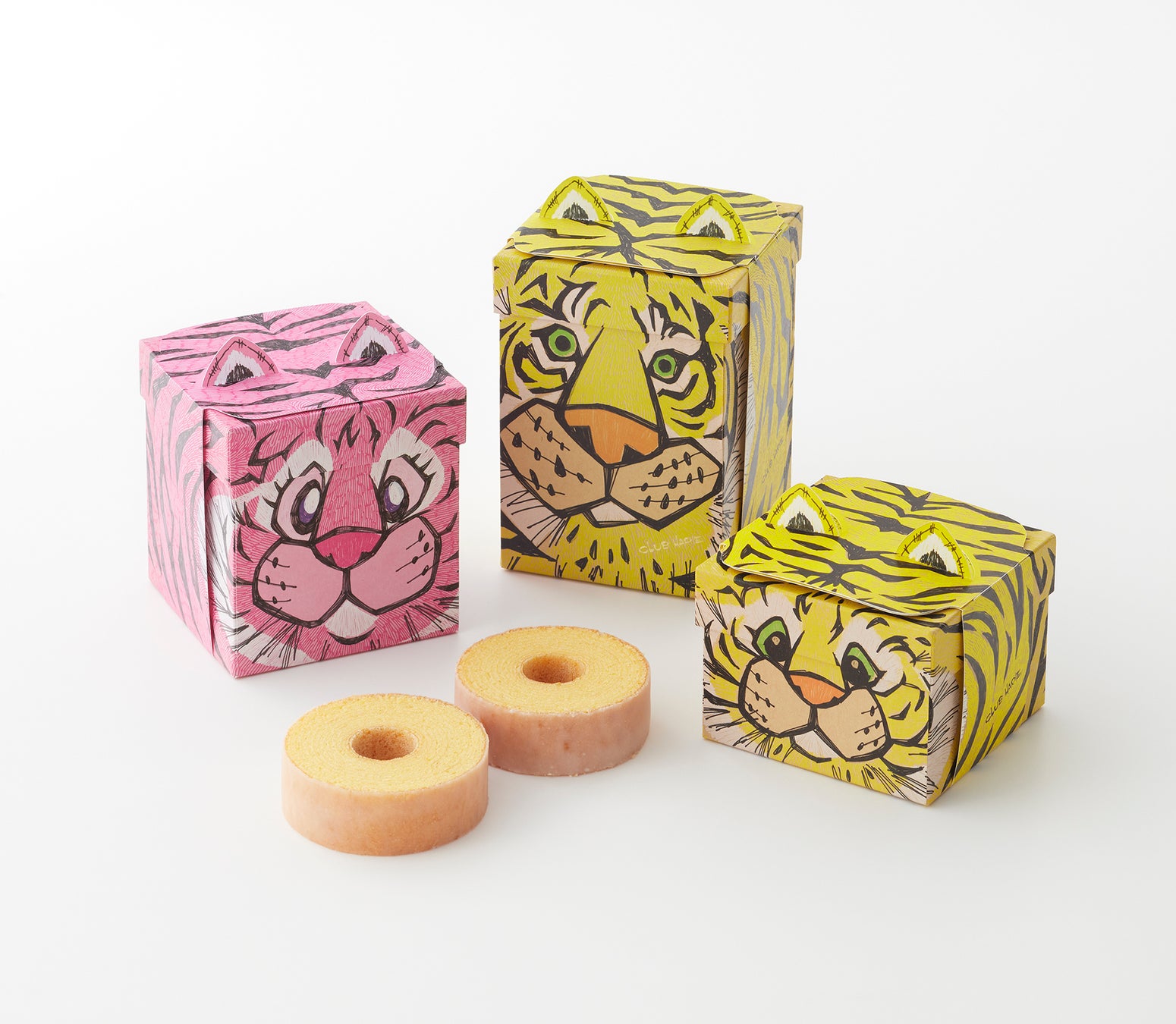 ふわふわ&しっとりのおいしさはそのままに、手のひらサイズになった「クラブハリエ」のバームクーヘン。箱いっぱいにデザインした虎柄パッケージが手に入るのは、阪神梅田本店だけ。