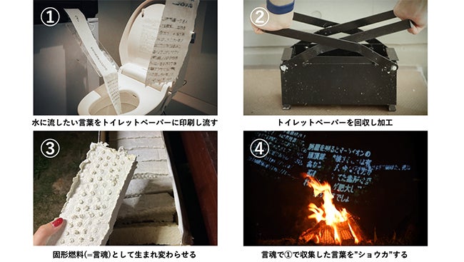 今回は水に流したい言葉をトイレットペーパーに印刷しトイレに流せる「BOT-ON(ボットン)」で回収した“体験者の水に流したい言葉”を再加工し、固形燃料へと生まれ変わらせた。人々の想いが籠った固形燃料を言魂(ことだま)と名付け水に流すだけではなく、勝手にお焚き上げを行い”ショウカ”させていくことにした。今後UROはこのように前作からバトンを引き継ぎ、次回作へ生かしていく作品の循環に挑戦していく。