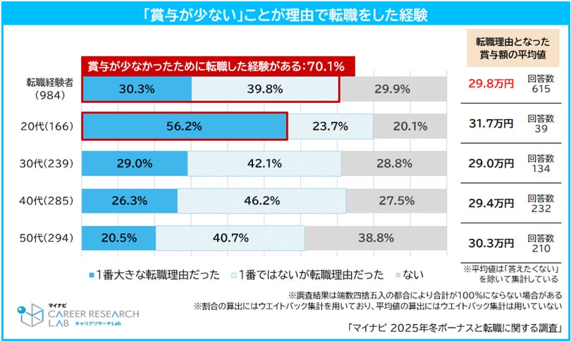 ◆転職経験者の約7割が「賞与が少ない」ことが理由で転職をした経験がある。転職理由となった賞与平均額は29.8万円