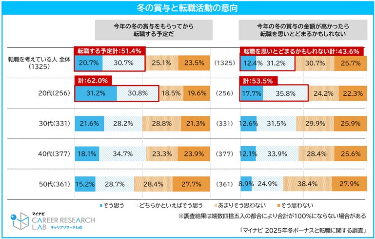 転職を検討している正社員の51.4%が「今年の冬の賞与支給後に転職する予定」と回答した。年代別では20代が62.0%で最多であった。企業にとって賞与支給のタイミングは、離職リスクの高まる時期といえる。