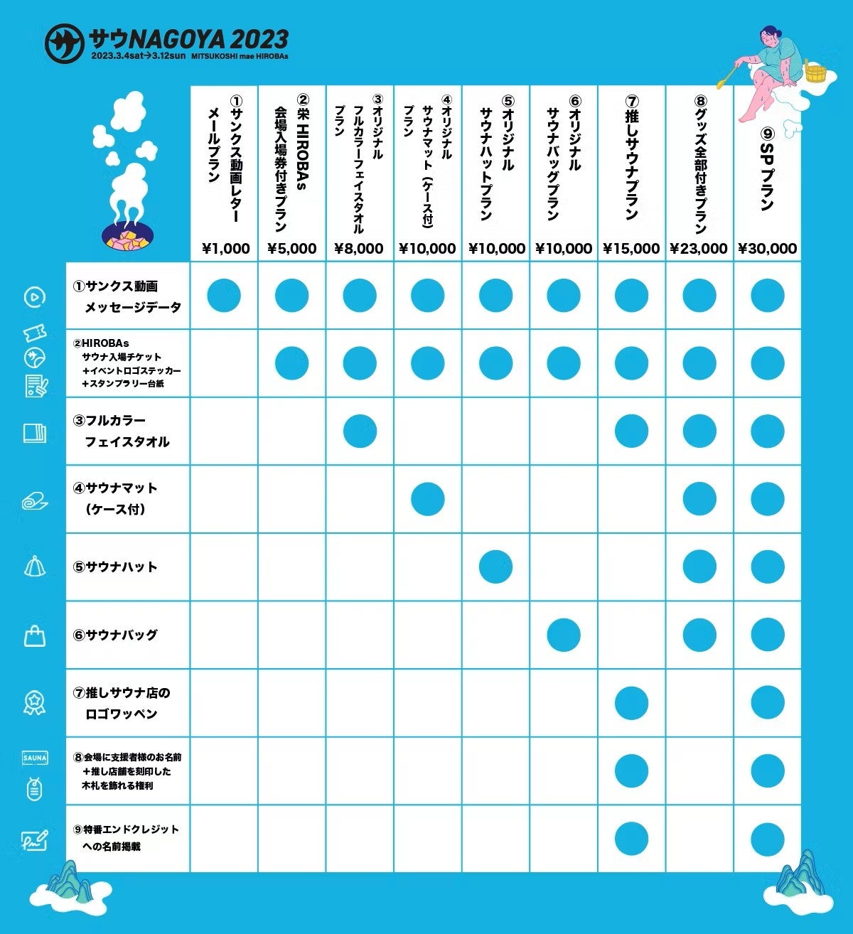 今回のクラウドファンディングでは名古屋の人気サウナ店10店舗全面協力のもとイベント限定オリジナルグッズを 販売します。