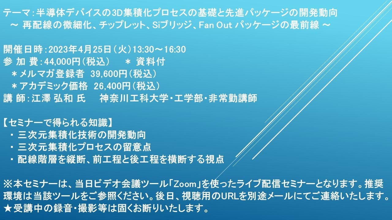 先端技術情報や市場情報を提供している(株)シーエムシー・リサーチ(千代田区神田錦町: https://cmcre.com/ )では、 各種材料・化学品などの市場動向・技術動向のセミナーや書籍発行を行っておりますが、 このたび「半導体デバイスの3D集積化プロセスの基礎と先進パッケージの開発動向~ 再配線の微細化、チップレット、Siブリッジ、Fan Out パッケージの最前線 ~」と題するセミナーを、 講師に江澤 弘和 氏 (神奈川工科大学・工学部・非常勤講師)をお迎えし、2023年4月25日(火)13:30より、 ZOOMを利用したライブ配信で開催いたします。 受講料は、 一般:44,000円(税込)、 弊社メルマガ会員:39,600円(税込)、 アカデミック価格は26,400円(税込)となっております(資料付)。