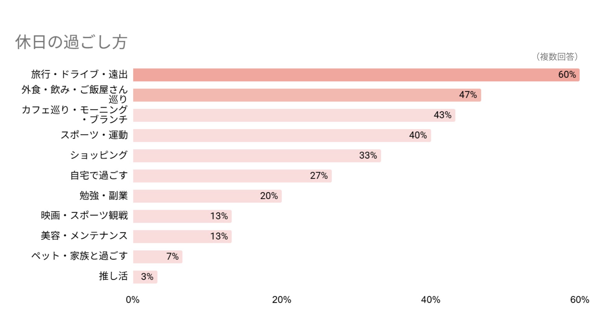 また、休日の過ごし方で最も多かったのは「旅行・ドライブ・遠出」が60%で圧倒的な1位。これは「新しい体験・旅行・自然」を大切にする価値観を、実現していることが分かります。また、「外食・飲み・ご飯屋さん巡り」(47%)、「カフェ巡り・モーニング・ブランチ」(43%)も高く、満足度の高いライフスタイルを追求していることが分かります。